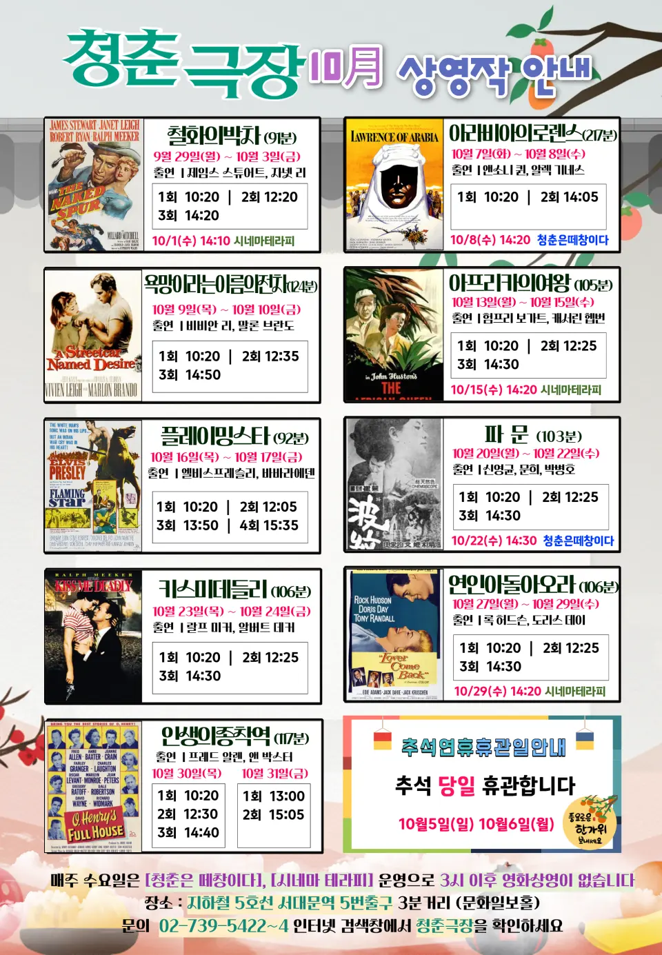 아라비아의 로렌스 (217분) 출연: 피터 오툴, 알렉 기네스 | 10.7 (화) ~ 10.8 (수) | 1~2회 | 10:20, 14:05 | 10.8 (수) 14:20 청춘은떼창이다 |