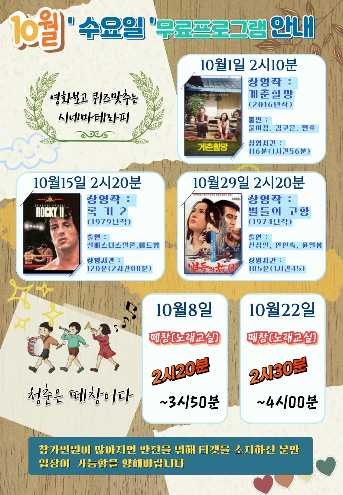 매주 수요일에는 “청춘은 떼창이다”와 “씨네마 테라피“같은 특별한 무료 프로그램이 열립니다.